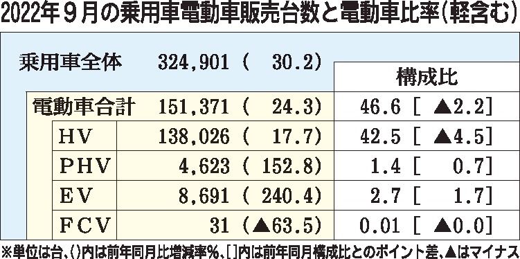 2022年度上期(4~9月)の電動車販売台数(乗用車、登録車・軽自動車合計)は、前年同期比5・8%増の71万5478台だった。乗用車販売全体に占める電動車の比率は同5・2㌽増の45・5%となり、半期ベースで初めて45%を超えた。電動車の9...