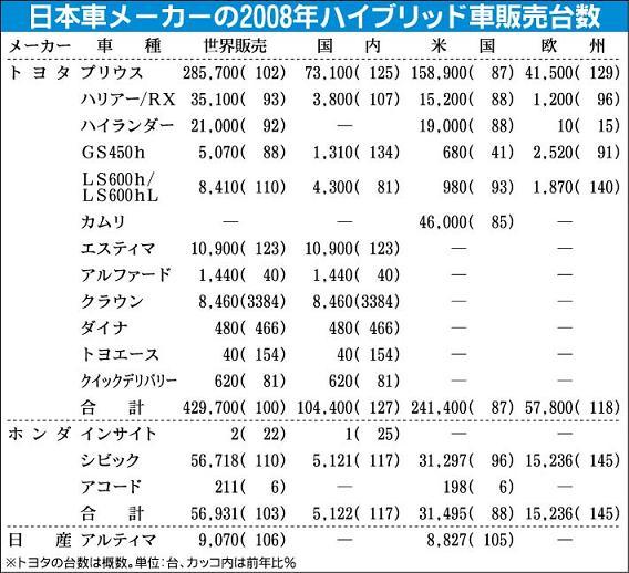 世界的な経済環境の悪化で自動車販売が減少する中、2008年のハイブリッド車(HV)販売も前年比微増を確保した。トヨタ自動車、ホンダ、日産自動車のHV販売は合計49万5658台で前年をわずかに0・5%上回り、07年の増加率34・7%に比べて...