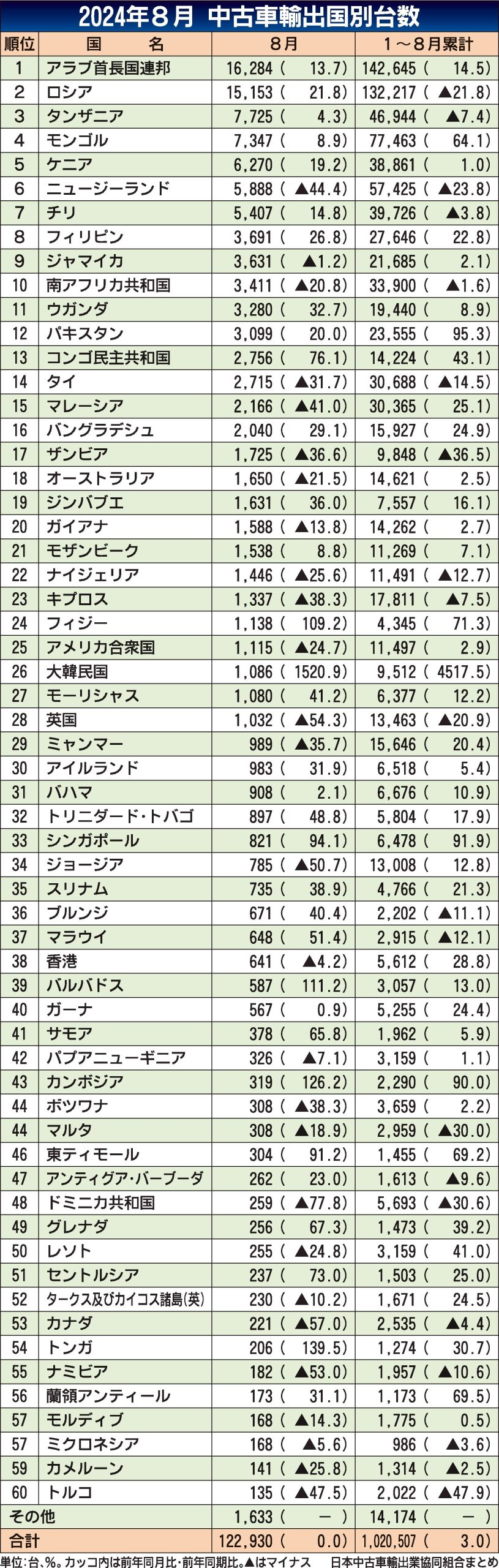 日本中古車輸出業協同組合(JUMVEA、佐藤博理事長)がまとめた2024年8月の中古車輸出台数(車両価格20万円以上)は12万2930台となり、前年同月を3台上回った。プラスになるのは4カ月ぶり。前年並みだったものの、直近5年間の同月実績...