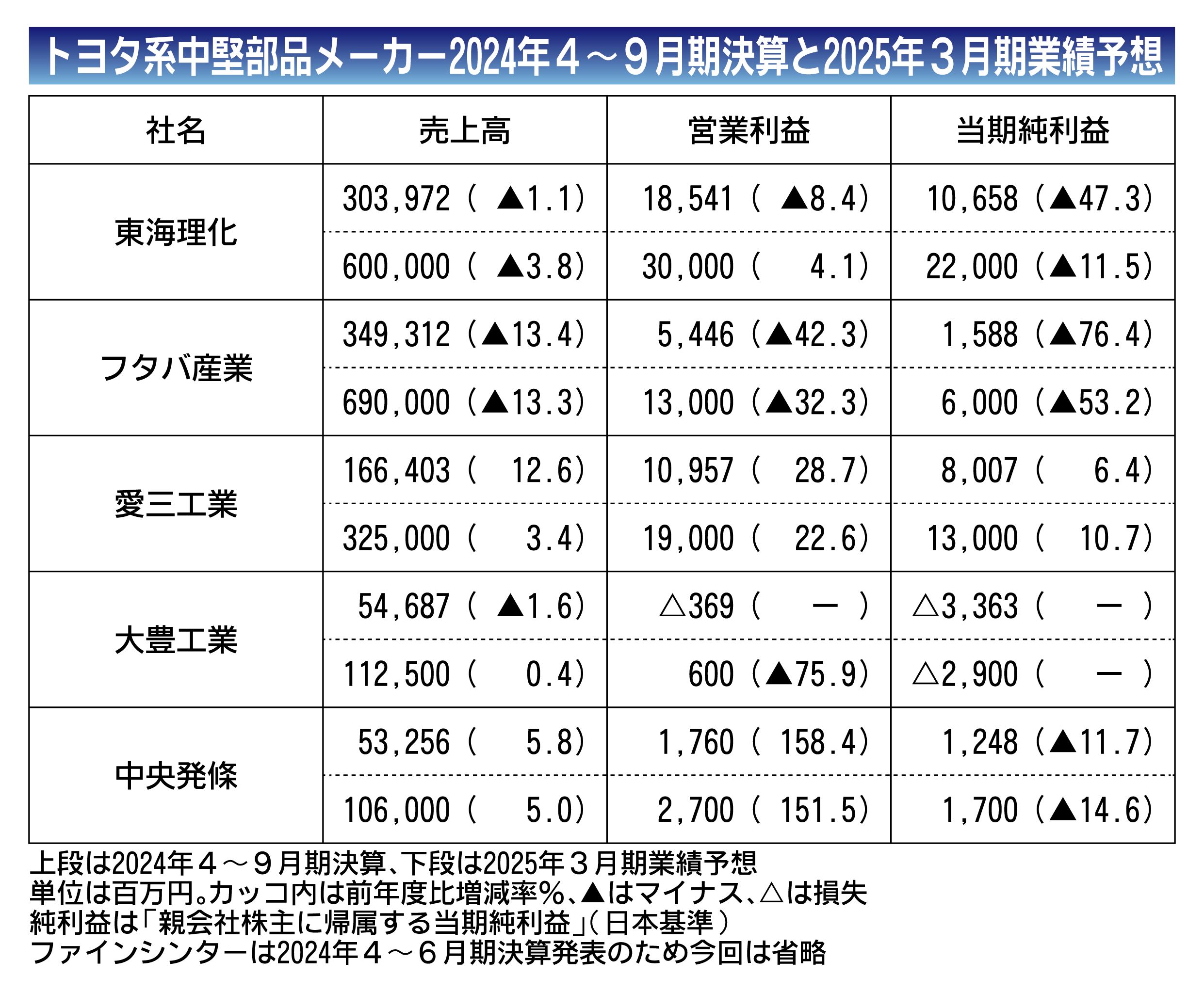 トヨタ自動車系中堅部品メーカーの先行きに不透明感が漂い始めた。ファインシンターを除く5社が30日に発表した2025年3月期の通期業績予想は、東海理化と中央発條が上方修正した一方、フタバ産業と大豊工業は下方修正した。各社は生産拠点や設備の集...