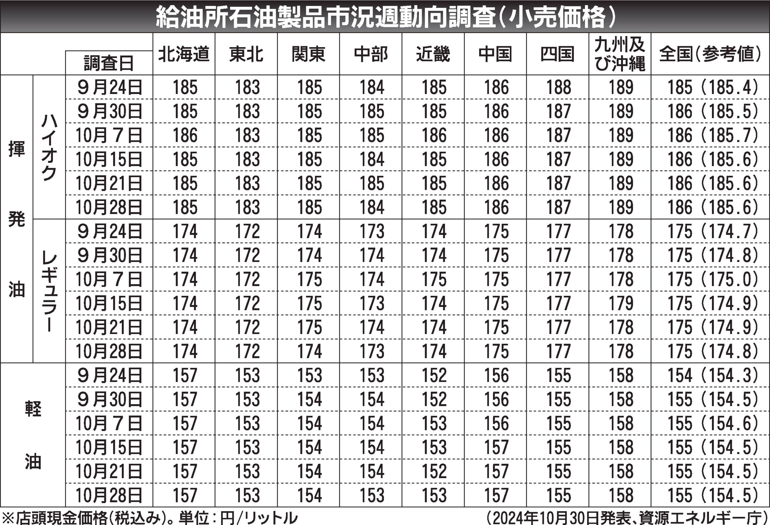 〈給油所石油製品市況週動向調査(小売価格)〉2024/9/24~10/28