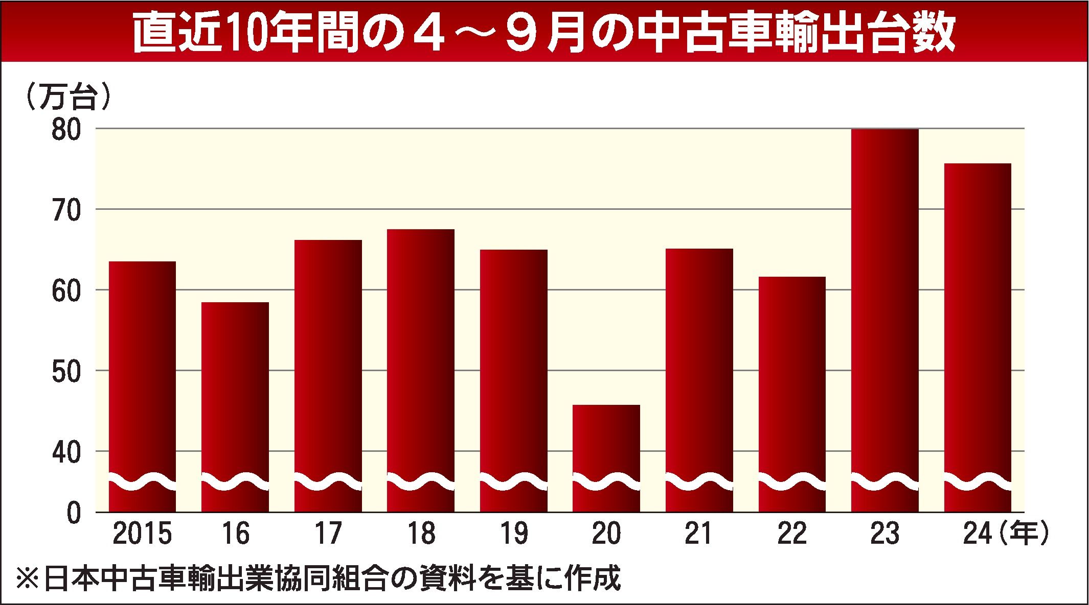 2024年度上期(4~9月)の中古車輸出(車両価格20万円以上)は前年同期比5.3%減の75万6624台となり、2年ぶりに前年実績を下回った。輸出事業者の仕入れ意欲は旺盛だが、海上輸送の混乱や輸送費の高騰が水を差した。ただ、高水準であるこ...
