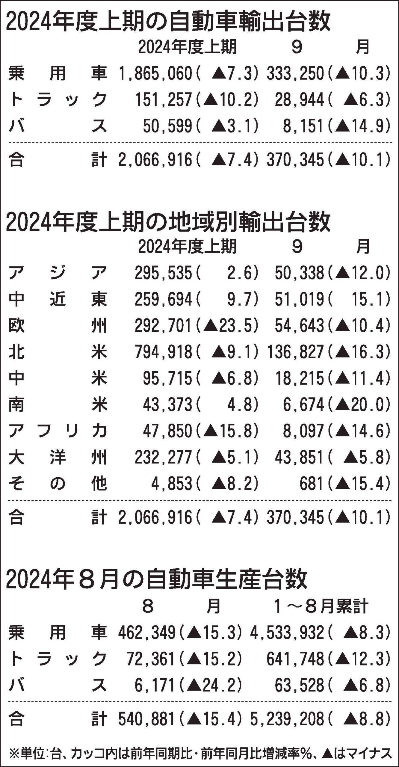 日本自動車工業会(片山正則会長)が31日に発表した2024年4~9月の自動車輸出台数は、前年同期比7.4%減の206万6916台で、4年ぶりにマイナスに転じた。アジア、中近東、南米以外の地域で減少した。特に欧州は23.5%減と大幅に減少し、輸出全体の台数を押し下げた。