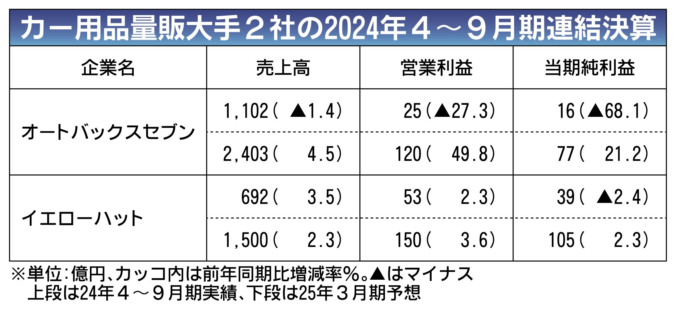 上場カー用品店2社が31日に発表した2024年4~9月期の連結決算は、そろって最終減益となった。イエローハットは2年連続、オートバックスセブンは3年ぶりのマイナス。同社は前年同期に計上した連結子会社2社の事業譲渡に伴う特別利益が影響。この...