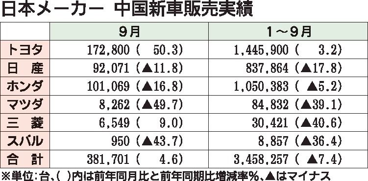 日本の自動車メーカー6社が発表した9月の中国新車販売は前年同月比4・6%増の38万1701台だった。中国政府の経済政策による後押しを受けてトヨタ自動車と三菱自動車はプラスとなったが、他の4社は半導体不足などの影響を受けて前年実績を下回った...