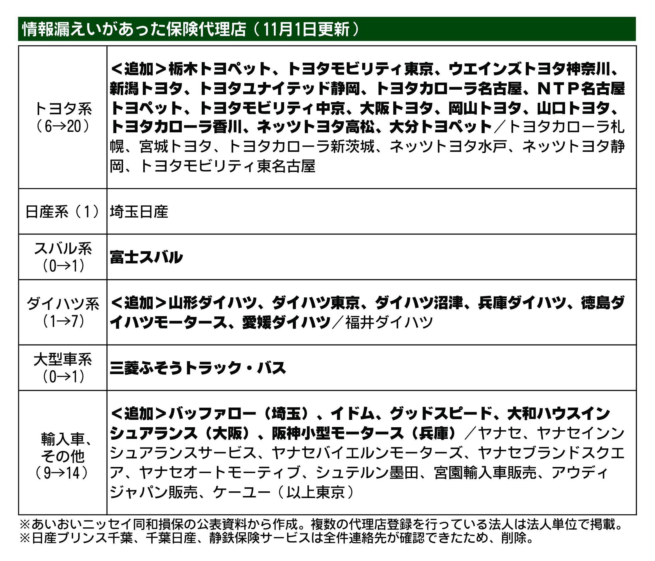 損害保険大手4社による一連の情報漏えい問題で、あいおいニッセイ同和損害保険は11月1日、漏えいが判明した自動車ディーラーを含む保険代理店のうち、連絡先の分からない顧客がいる代理店が新たに27社確認されたと発表した。初めて公表した9月27日の時点では20社だったが、これまでに顧客と連絡が取れたとして3社を一覧から削除。合計で44社となった。最新の一覧は同社のホームページで掲載している。
