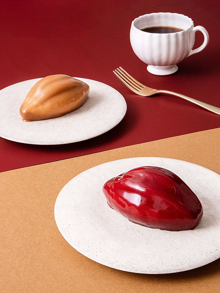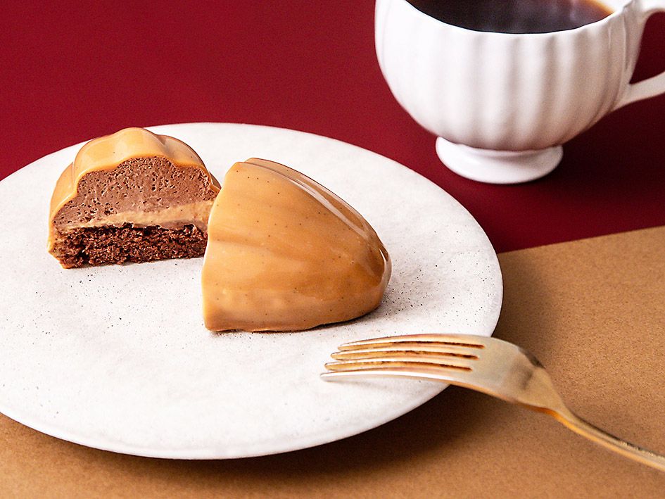 チョコレートケーキのカカオ1はチョコレートのムースやクリーム、カカオ豆の外皮を煮出したバニラクリームをアーモンドチョコレートスポンジで仕上げている。表面は1シリーズのイメージに合わせた特別カラーを、グラサージュキャラメルまたはグラサージュあまおうで彩っている。