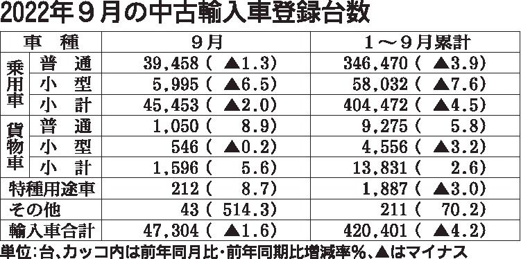 日本自動車輸入組合(JAIA、クリスチャン・ヴィードマン理事長)が13日発表した9月の中古輸入車登録台数は、前年同月比1・6%減の4万7304台で2カ月ぶりのマイナスとなった。 乗用車は同2・0%減の4万5453台で2カ月ぶりの前年割れ。...