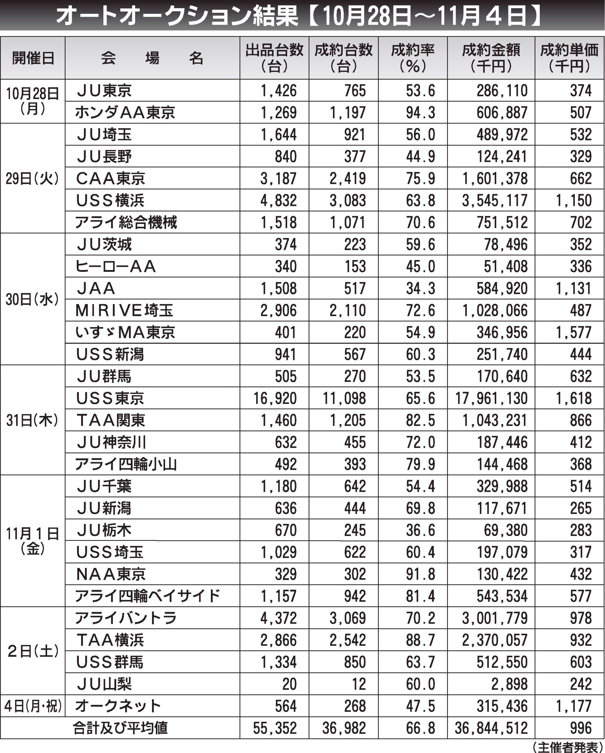 〈オートオークション結果〉首都圏 2024/10/28~11/4