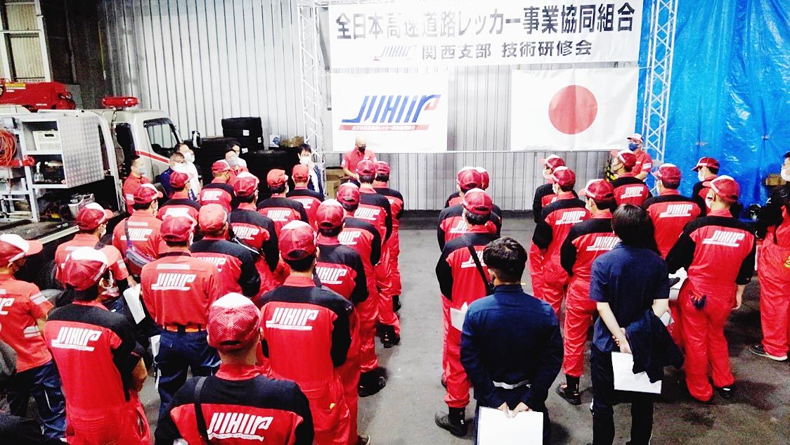 全日本高速道路レッカー事業協同組合(JHR)関西支部(中村栄祥支部長)は、あかつき神戸中央営業所(神戸市兵庫区)でトラックのスペアタイヤ交換作業に関する技術研修会を開催し、組合員事業者の社員ら45人が参加した=写真。 研修では大型、中型ト...