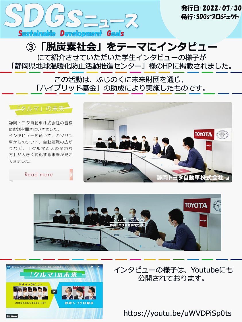 静岡トヨタ(太田勝之社長)は「社会の課題解決に貢献する企業」として、2021年1月に「静岡トヨタSDGs宣言」を行い、各店舗や部署でSDGs(持続可能な開発目標)の達成に寄与できる取り組みを積極的に展開している。店舗の活動をポスターに掲出...