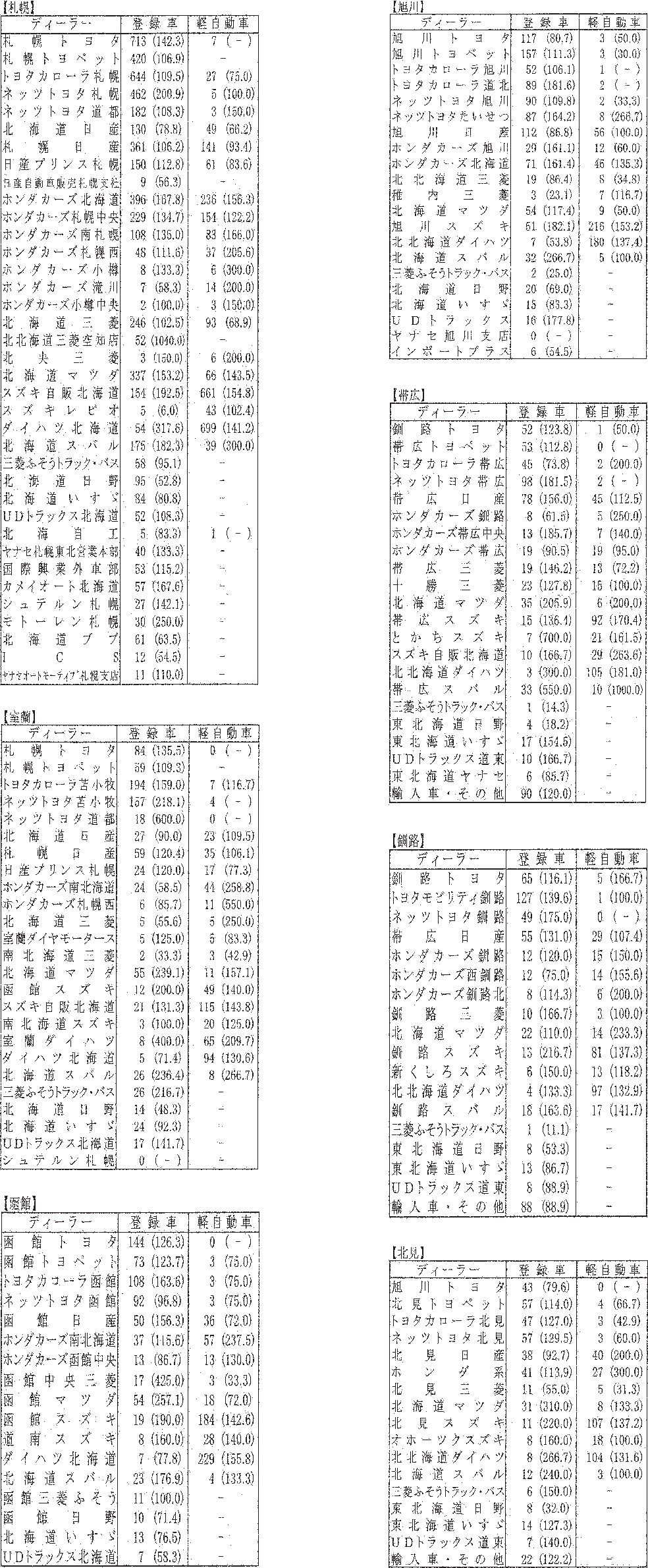 〈9月度全道管内別ディーラー別新車登録・届け出台数〉(カッコ内は前年同月比)※札幌管内ホンダ系・スズキ系の登録台数は自販連正会員分