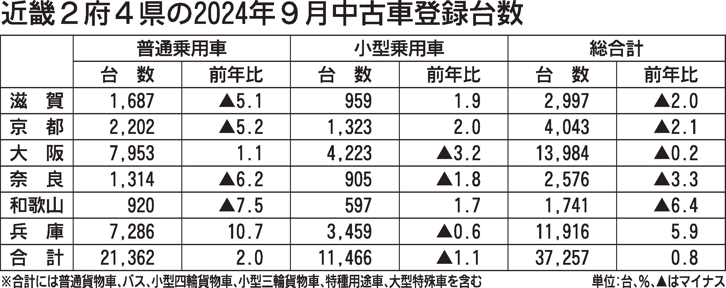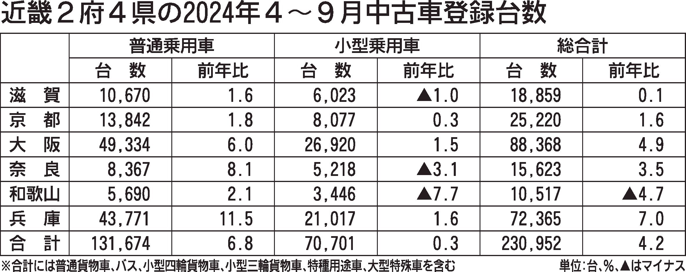 近畿2府4県の2024年度上期(4~9月)の中古車登録実績(軽自動車を除く)がまとまった。新規・移転・変更手続きを合算した登録台数は、前年同期比4.2%増の23万952台と、2年連続のプラスを確保した。 車種別では、普通乗用車が同6.8%...