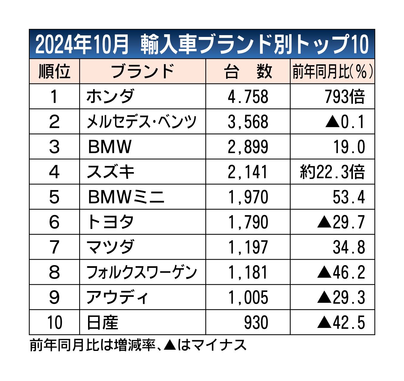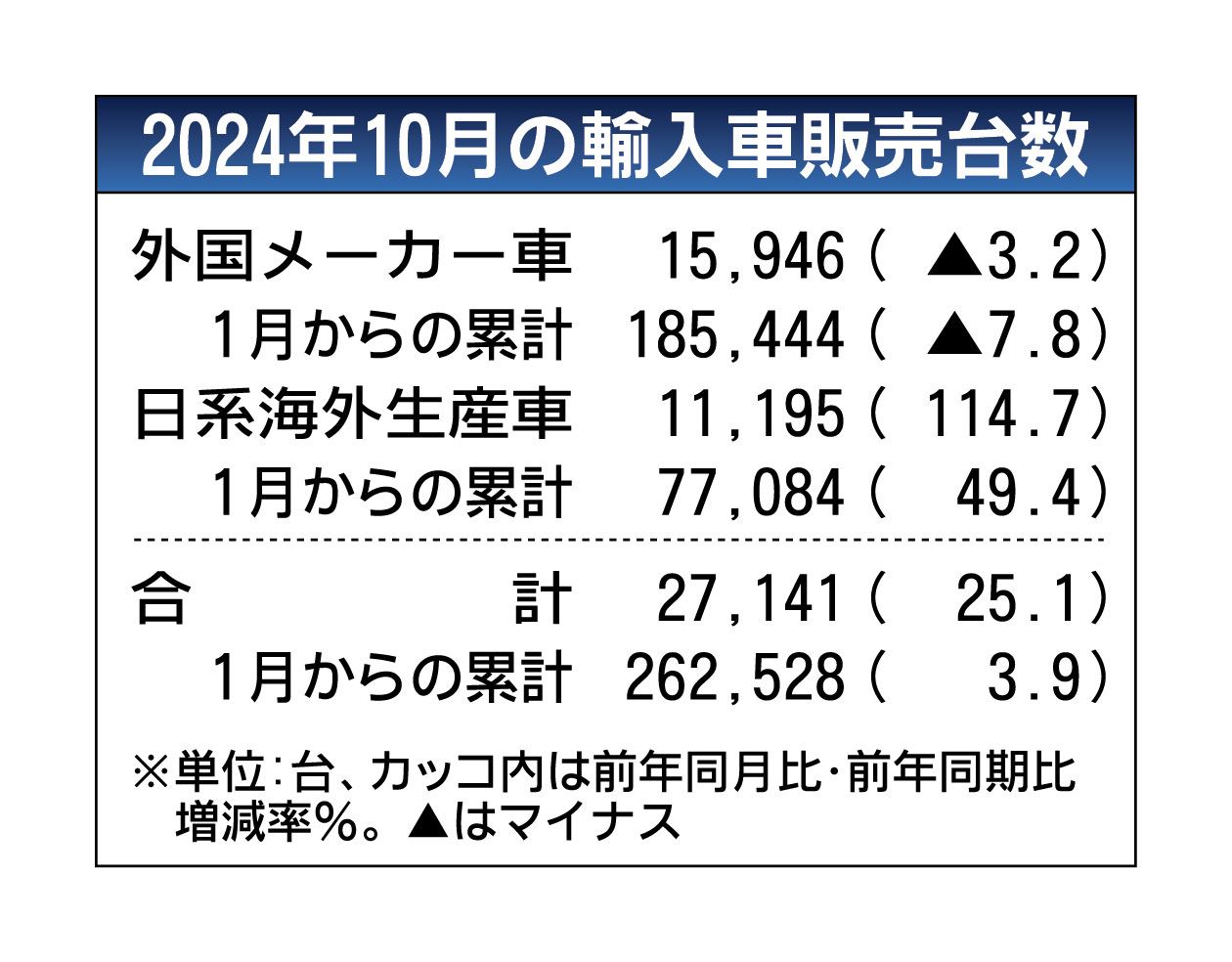 日本自動車輸入組合(JAIA、上野金太郎理事長)が7日発表した2024年10月の外国メーカー車新規登録台数は、前年同月比3.2%減1万5946台となり10カ月連続で減少した。乗用車でBMWミニやポルシェなど8ブランドが10月として過去最高となった一方、フォルクスワーゲン(VW)が同46.2%減の1181台になるなどボリュームの大きい主要銘柄で落ち込みが目立ったことが影響した。登録車全体に占める外国メーカー車のシェアは、同0.6ポイント減の6.2%だった。
