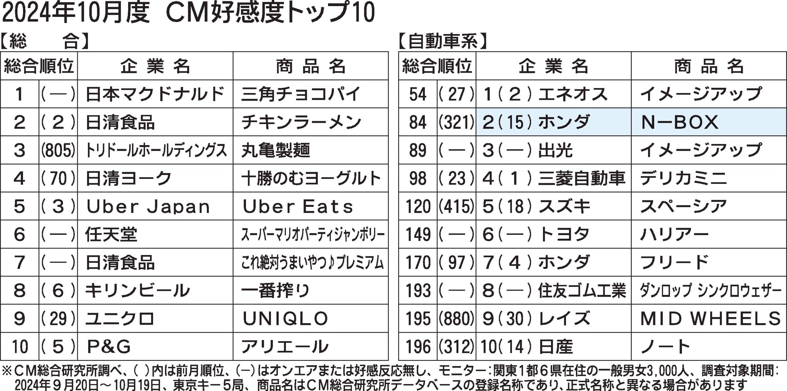 CM総合研究所(関根心太郎代表、東京都千代田区)は、2024年10月度のCM好感度ランキングを公表した。総合ランキングでは日本マクドナルドが2カ月連続で首位、丸亀製麺のイメージCMが3位に急浮上した。自動車業類は16カ月連続でトップテンを逃した。