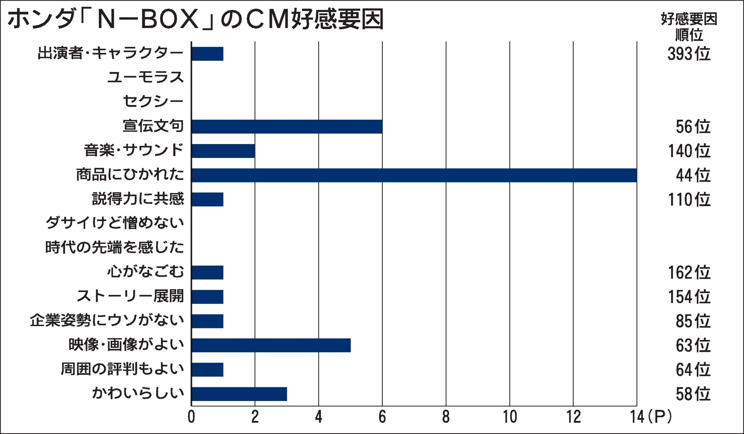 CM好感要因の「商品にひかれた」では、30歳代の男女や50歳代の男性を中心にポイントを伸ばし、好スコアを獲得した。視聴者からは「軽自動車なのに車内空間が広く見えた」「乗りやすそう。車の中でくつろげるスペースがあるのも良いと思った」などのコメントが寄せられた。