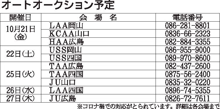 〈オートオークション予定〉中四国地区 2022/10/21~27