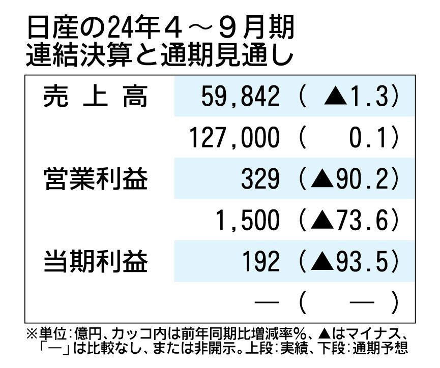 日産自動車は11月7日、3000億円の黒字としていた2025年3月期の当期純利益見通しを「未定」に修正した。人員削減などを盛り込んだ新たな事業構造計画が業績に与える影響が合理的に算定できないため。売上高と営業利益の見通しも引き下げた。対ドルの為替レートを円高に見直したことに加えて、米国での販売費用の増加などが利益を押し下げる。グローバル販売計画も25万台少ない340万台に引き下げた。24年4~9月も営業利益、当期純利益ともに前年同期から9割減の大幅減益となった。内田誠社長は同日開いた決算説明会で「市場環境の変化と当社固有の課題が大きく影響した」と総括した。