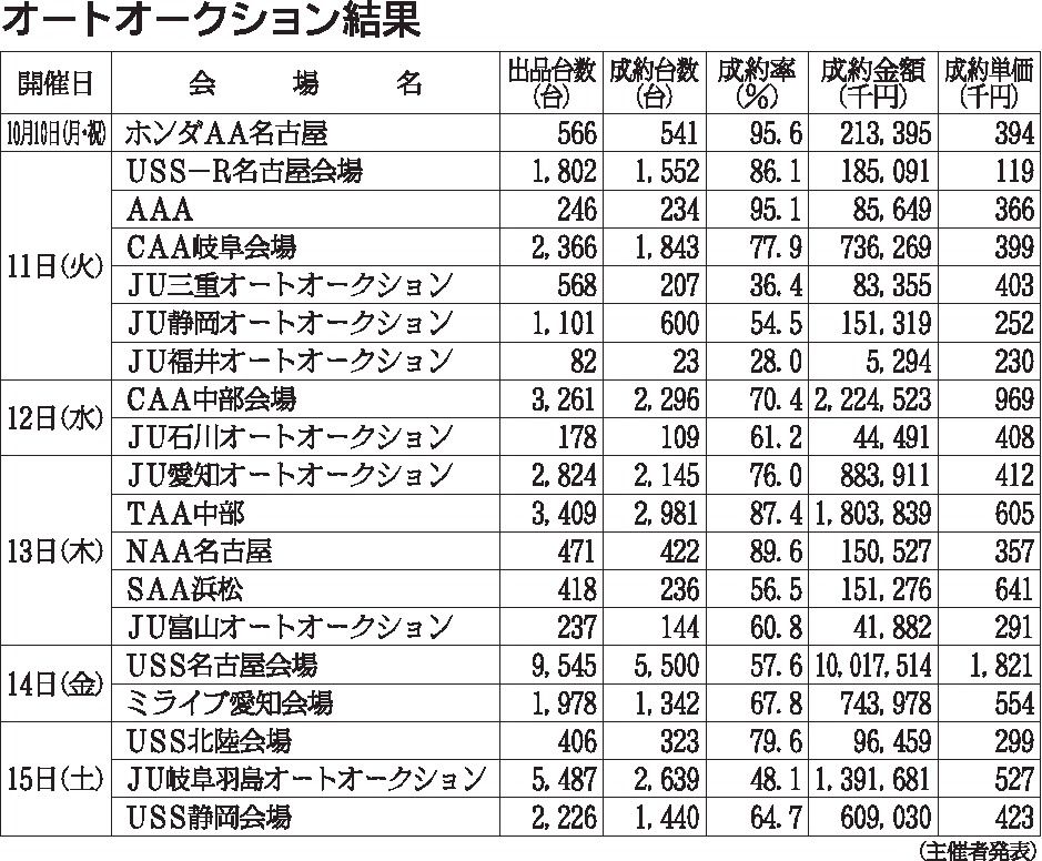 〈オートオークション結果〉中部地区 2022/10/10~15