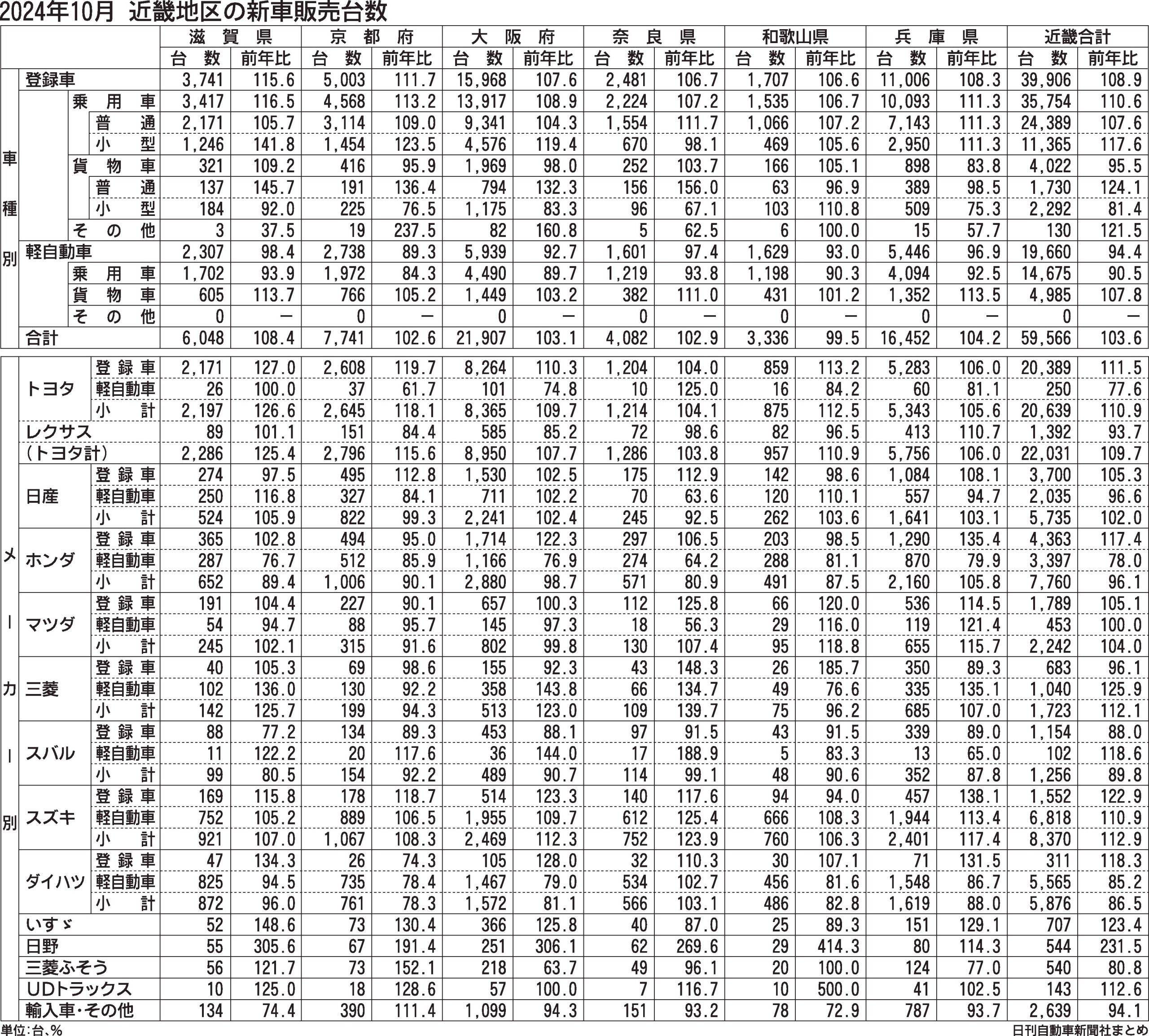 近畿2府4県の10月の新車販売台数(軽自動車含む)は、前年同月比3.6%増の5万9566台で4カ月連続の前年超えとなった。和歌山県を除く5府県でプラスを確保し、下期のスタートとしては堅調な滑り出しとなった。 登録車は同8.9%増の3万99...
