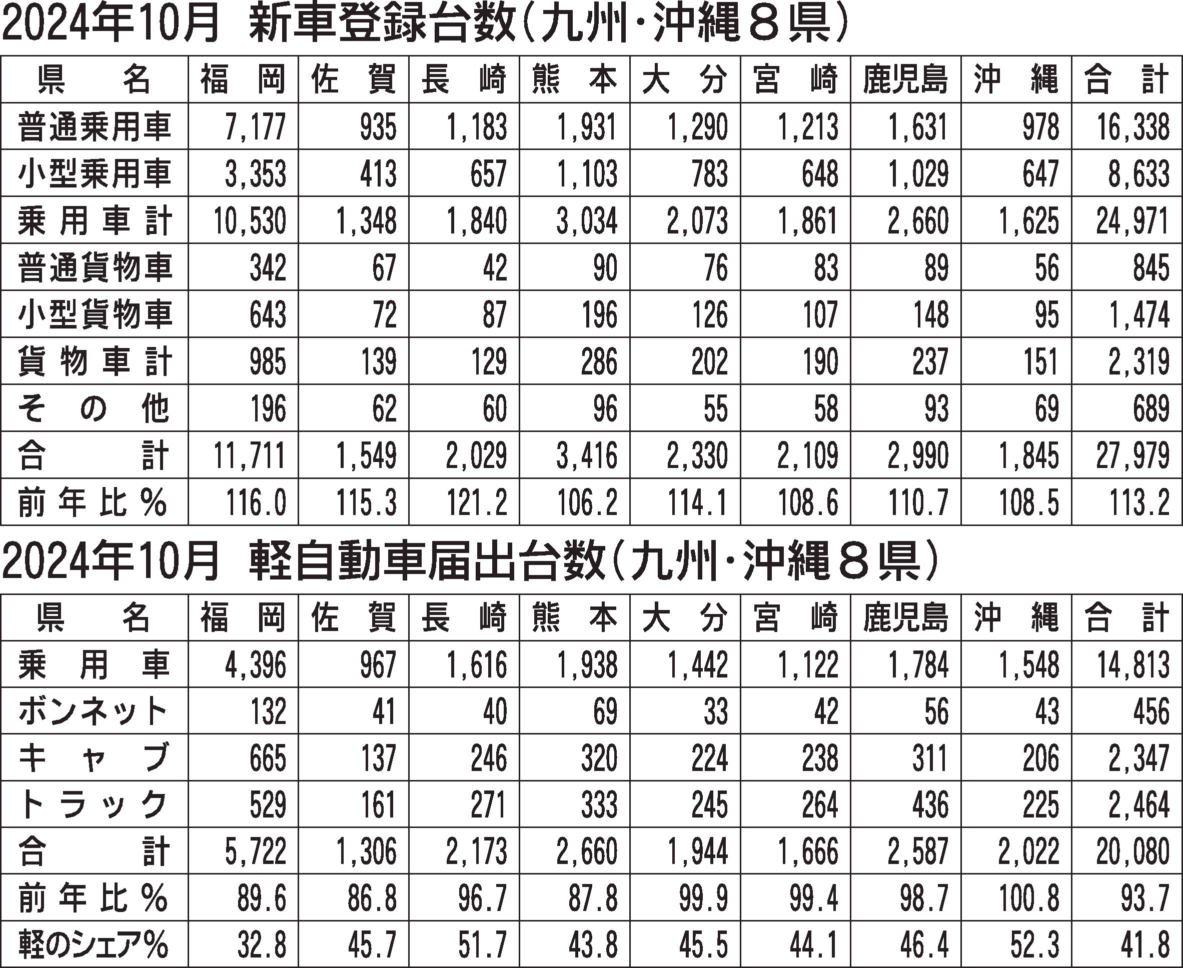 九州・沖縄地区の10月の新車販売台数(登録車と軽自動車合計)は、前年同月比4.2%増の4万8059台となった。軽自動車の減少を登録車がカバーし、合計では2カ月連続で前年実績を上回った。登録車は全8県が前年超えし、4カ月連続でプラス基調を維...