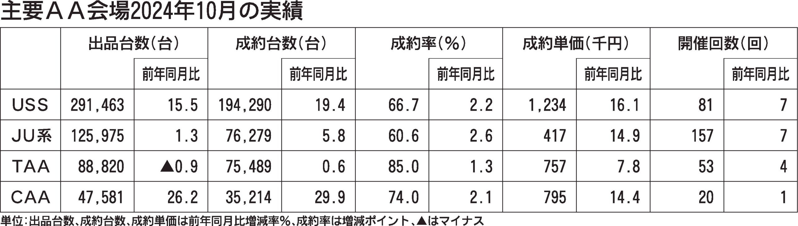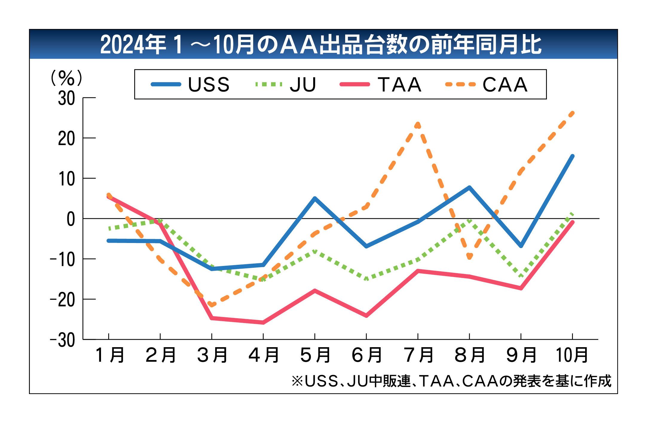 中古車オークション(AA)の主要4事業者が発表した2024年10月の実績は、トヨタユーゼック(北口武志社長、千葉市美浜区)が運営するトヨタ・オート・オークション(TAA)を除く3事業者の出品台数が前年同月を上回った。4事業者の半数がプラス...