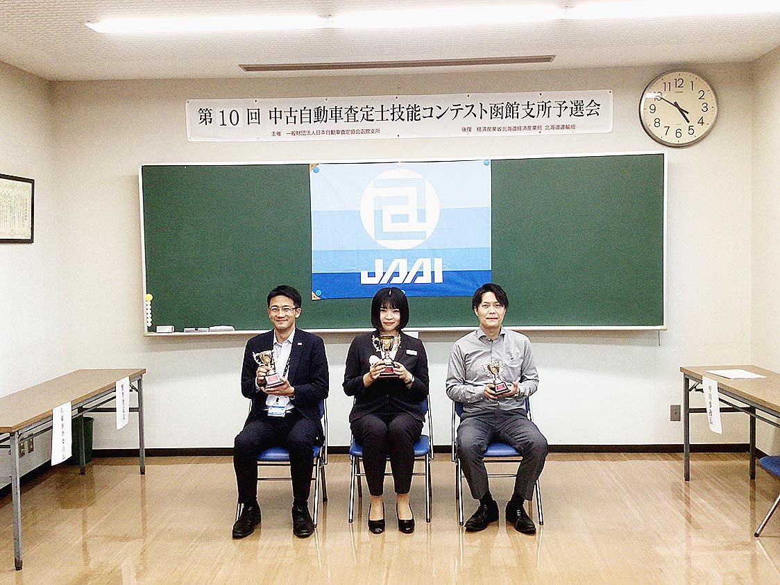 日本自動車査定協会函館支所(高木和良支所長)は、中古自動車査定士技能コンテストを開催し、函館トヨタの佐々木萌那さん=写真中央=が女性として初めて最優秀査士賞に輝いた。来年7月に開かれる全国大会出場への切符を手にした。 同支所が開く査定コン...