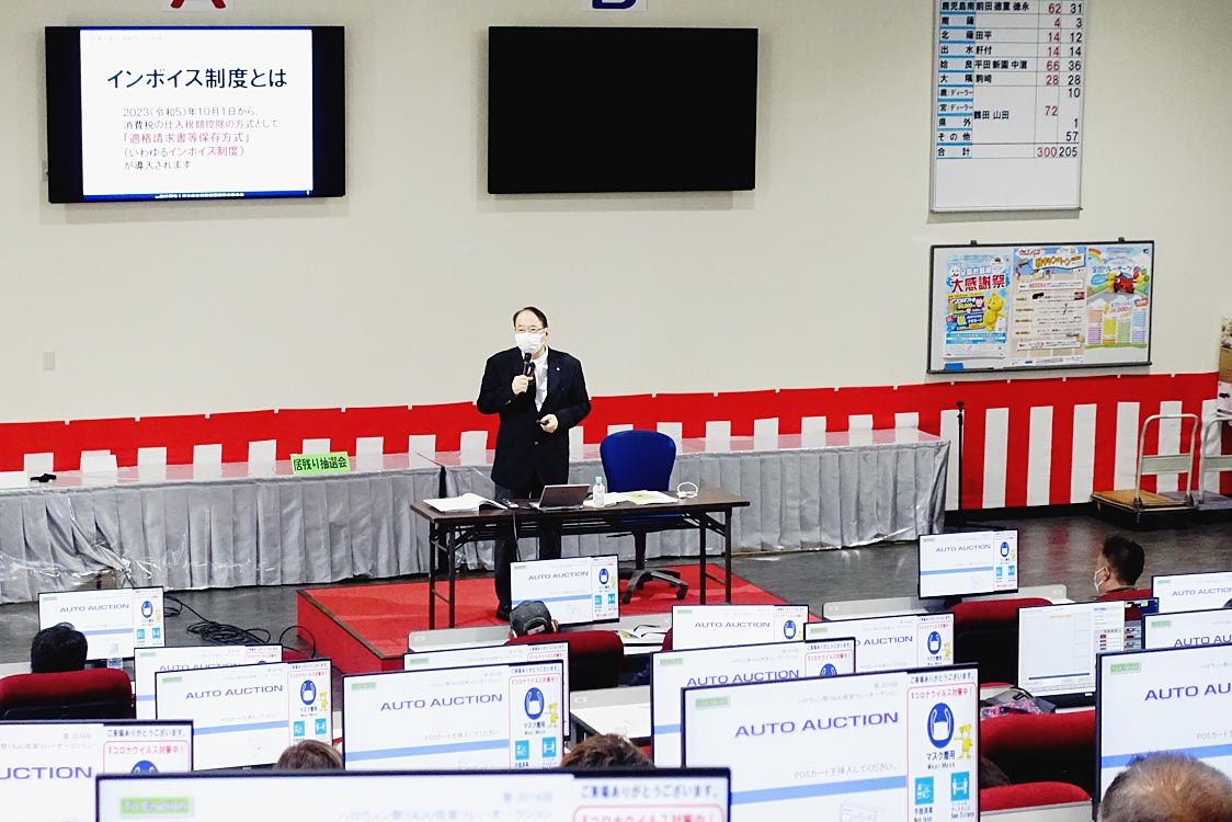 【鹿児島】JU鹿児島(新園康男理事長)はインボイス制度とデジタル出品システムの説明会を開催した=写真。古物商管理者講習会の実施と合わせて講習した。講師はJU中販連の山下晋常務理事らが務めた。組合員108人が出席した。 インボイス制度の説明...