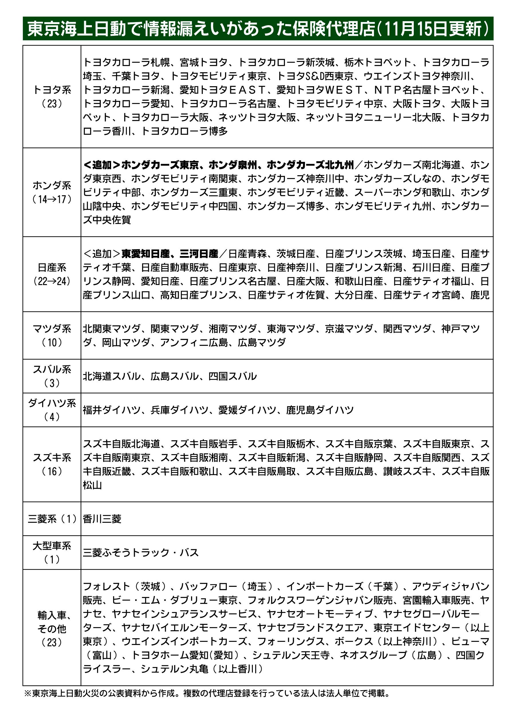 損害保険大手4社による情報漏えい問題で、東京海上日動火災保険は11月15日、漏えいが判明した自動車ディーラーを含む保険代理店のうち、連絡先の分からない顧客がいる代理店が新たに5社確認され、合計122社になったと発表した。10月1日の初公表以降、今回が6回目の更新となる。