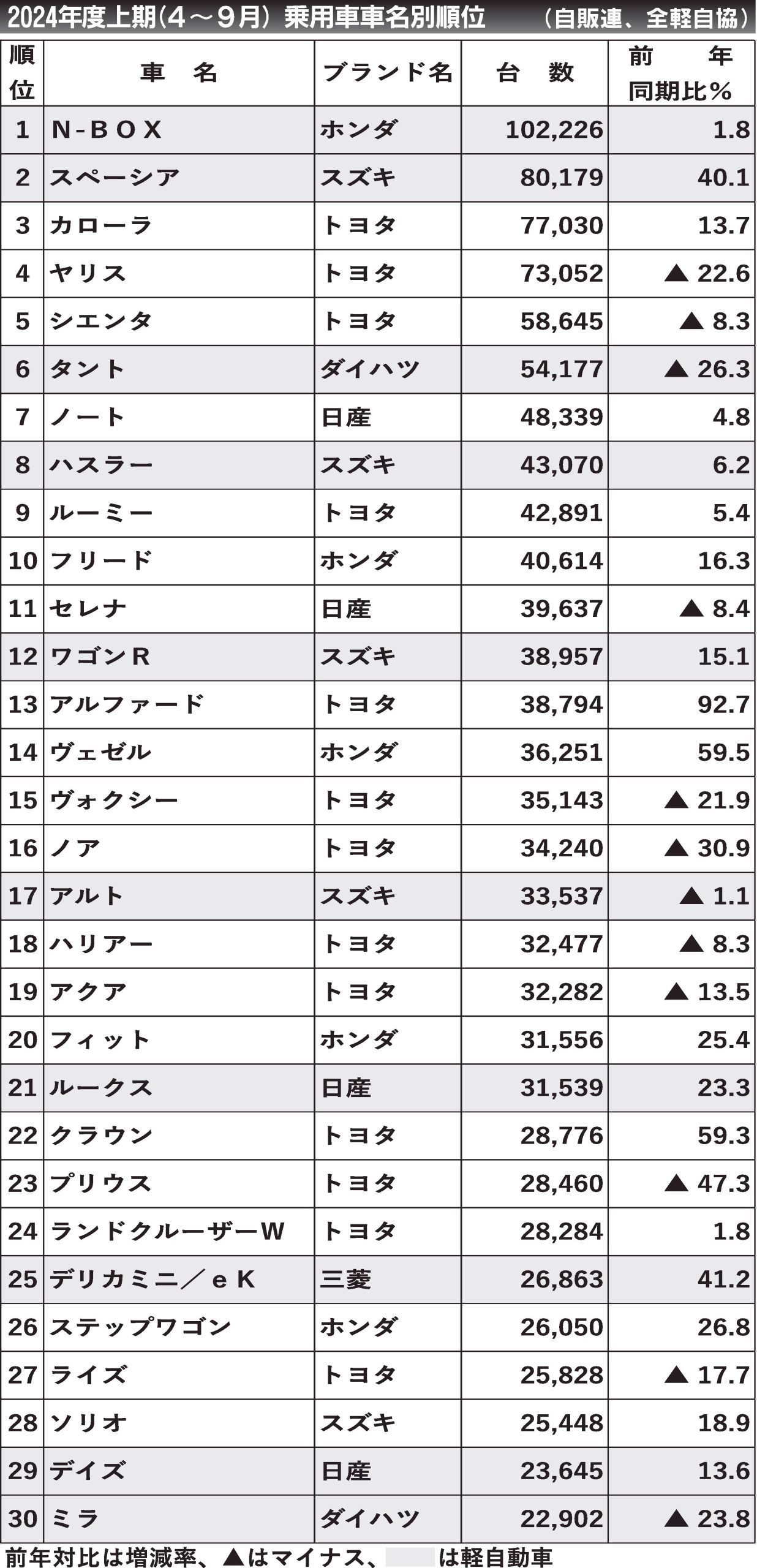 〈2024年度上期(4~9月)乗用車車名別順位〉