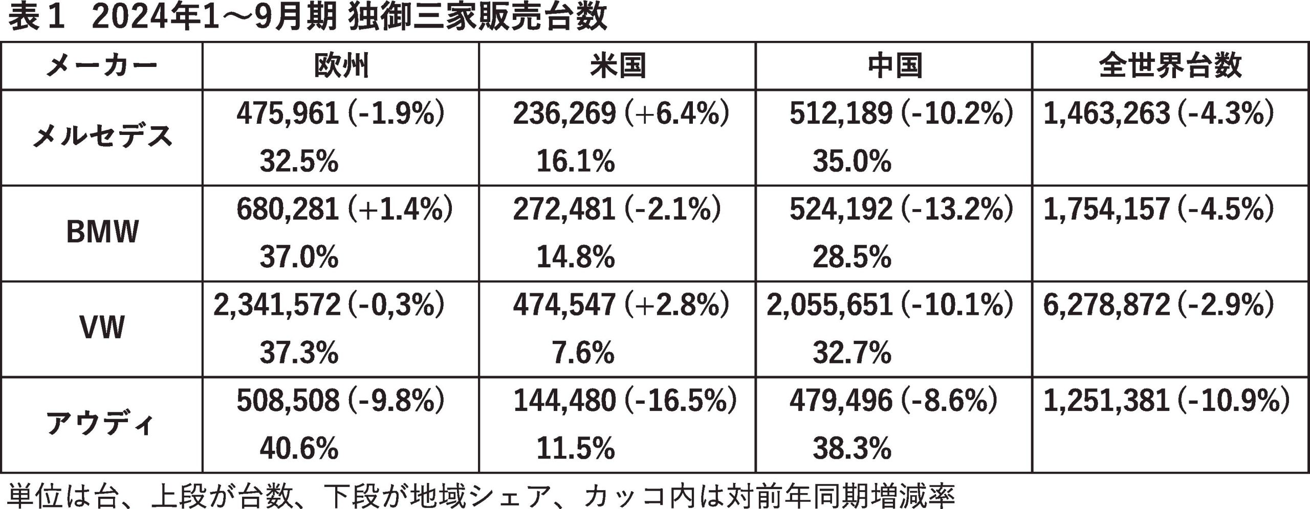 A.ドイツ乗用車御三家(11月5日付本紙参照) 7~9月の新車販売は、主要3地域(欧州・米国・中国)すべてで前年同期を下回ったが、1~9月は1桁プラス。全世界の乗用車登録は同様に前年同期比1.2%増の5709万台だった。主要3地域でのドイ...