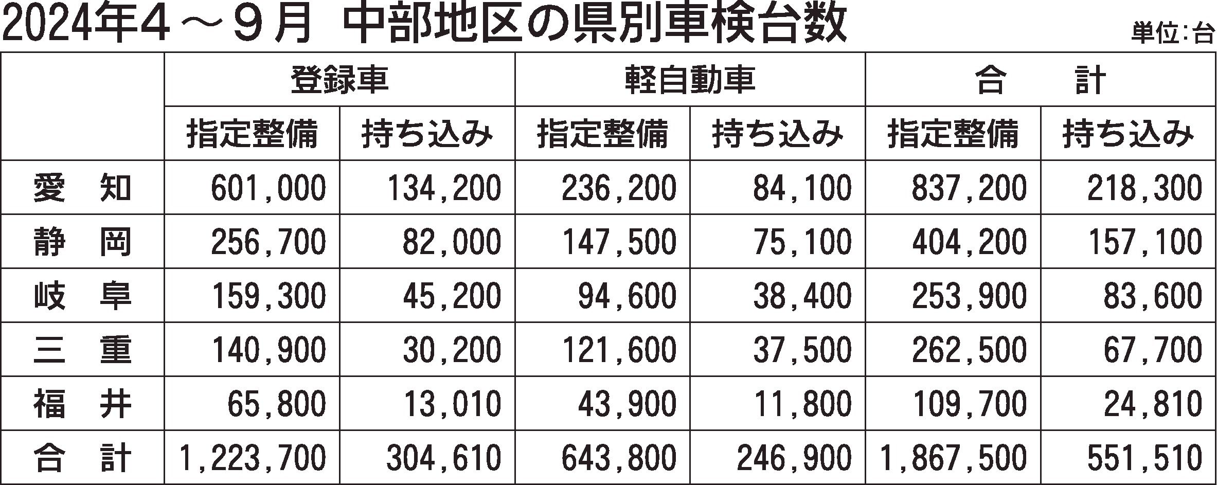 中部地区2024年度上期(4月~9月)の継続検査(車検)台数(登録車+軽自動車)は、前年同期比0.1%(2010台)減の241万9010台だった。上期としては3年連続の減少。軽自動車は同1.2%増の89万700台だったものの、登録車が同0...