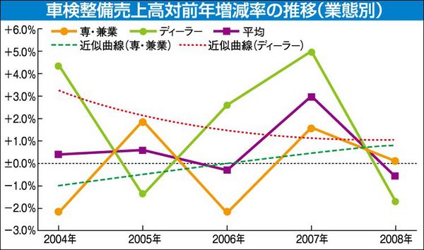 総整備売上高の6兆円台回復からわずか1年で5兆円台へと転じた整備業界。ただ、2008年度の調査結果においては、専・兼業の健闘が目を見張るものがある。今回は大幅な落ち込みを見せたディーラーだが、昨今の新車販売の低迷から各社がアフター事業の拡...
