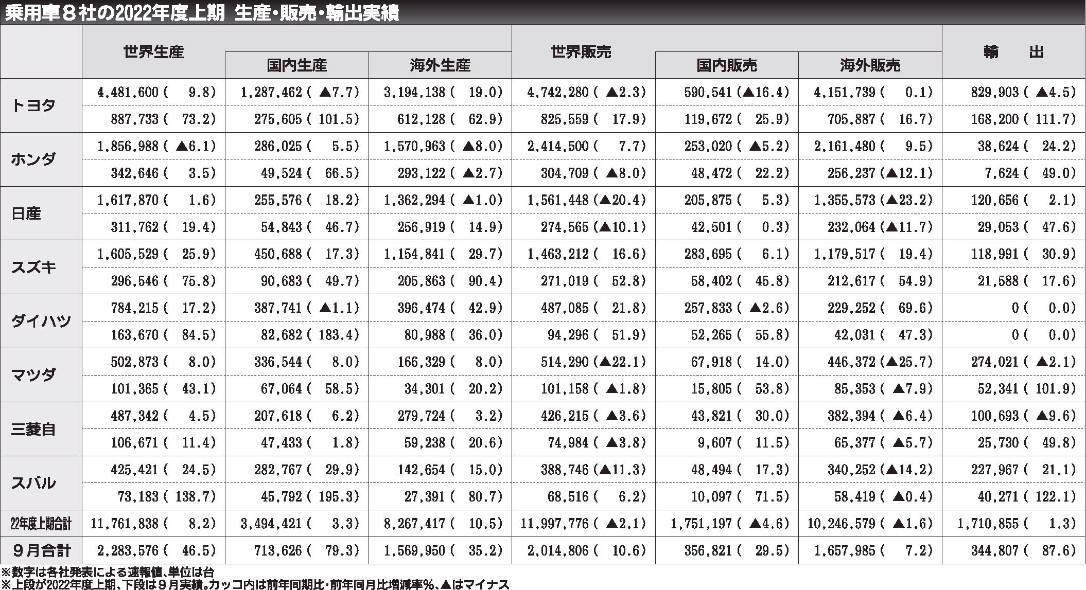 乗用車メーカー8社が28日に発表した2022年度上期(4~9月)の世界生産台数は前年同期比8・2%増の1176万1838台で、上期として2年連続の増加となり、半期ベースでは2半期ぶりのプラスとなった。国内生産は同3・3%増、海外生産は同1...