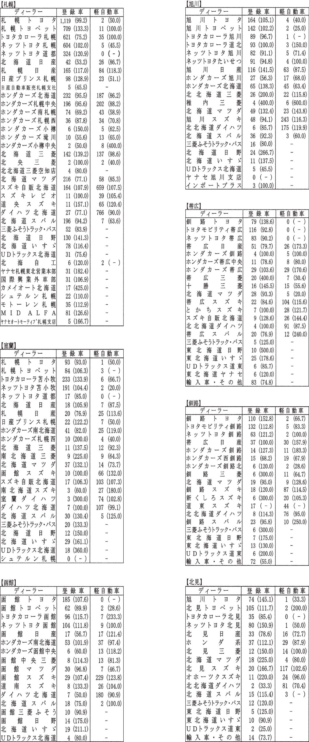 〈10月度全道管内別ディーラー別新車登録・届け出台数(カッコ内は前年同月比)〉札幌管内ホンダ系・スズキ系の登録台数は自販連正会員分
