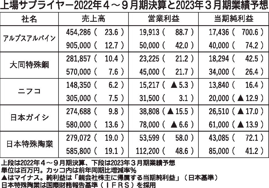 〈上場サプライヤー2022年4~9月期決算と2023年3月期業績予想〉(11/1付)