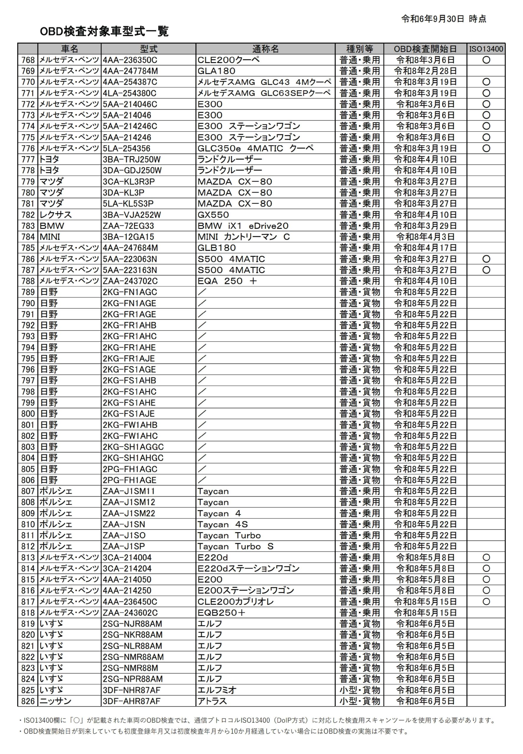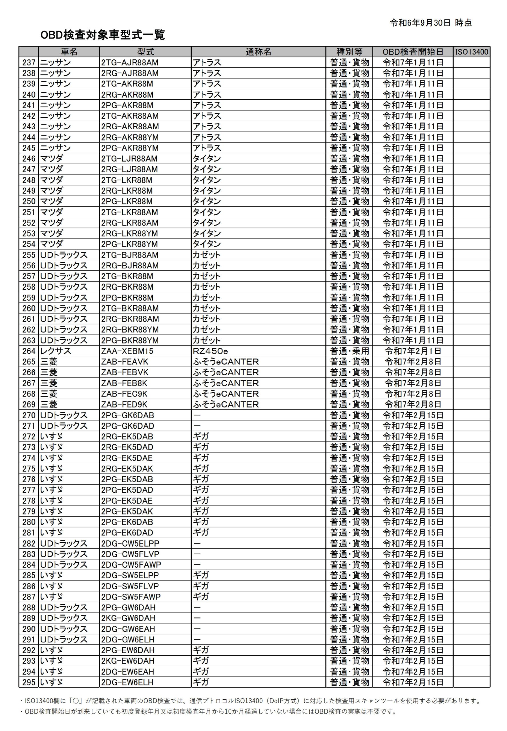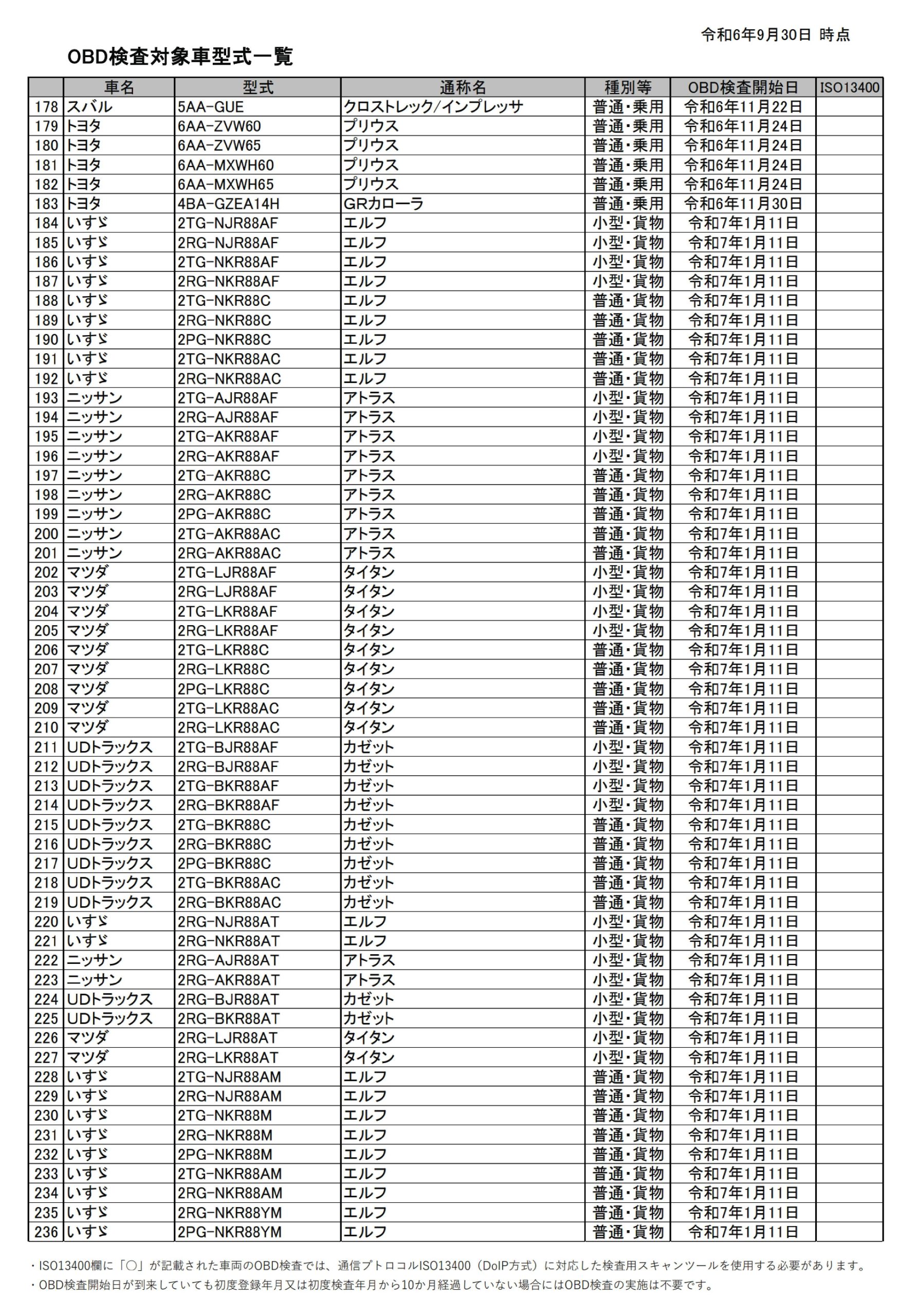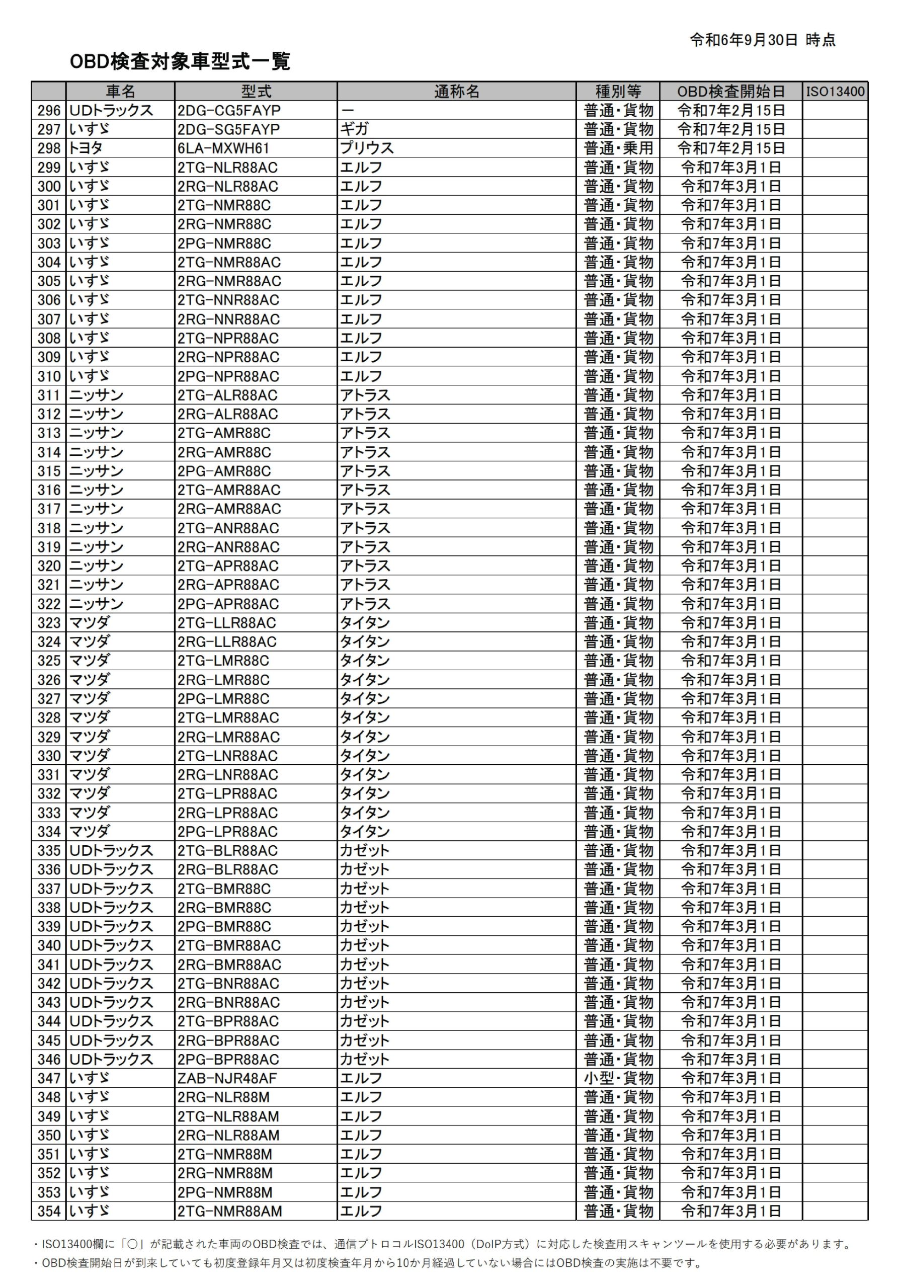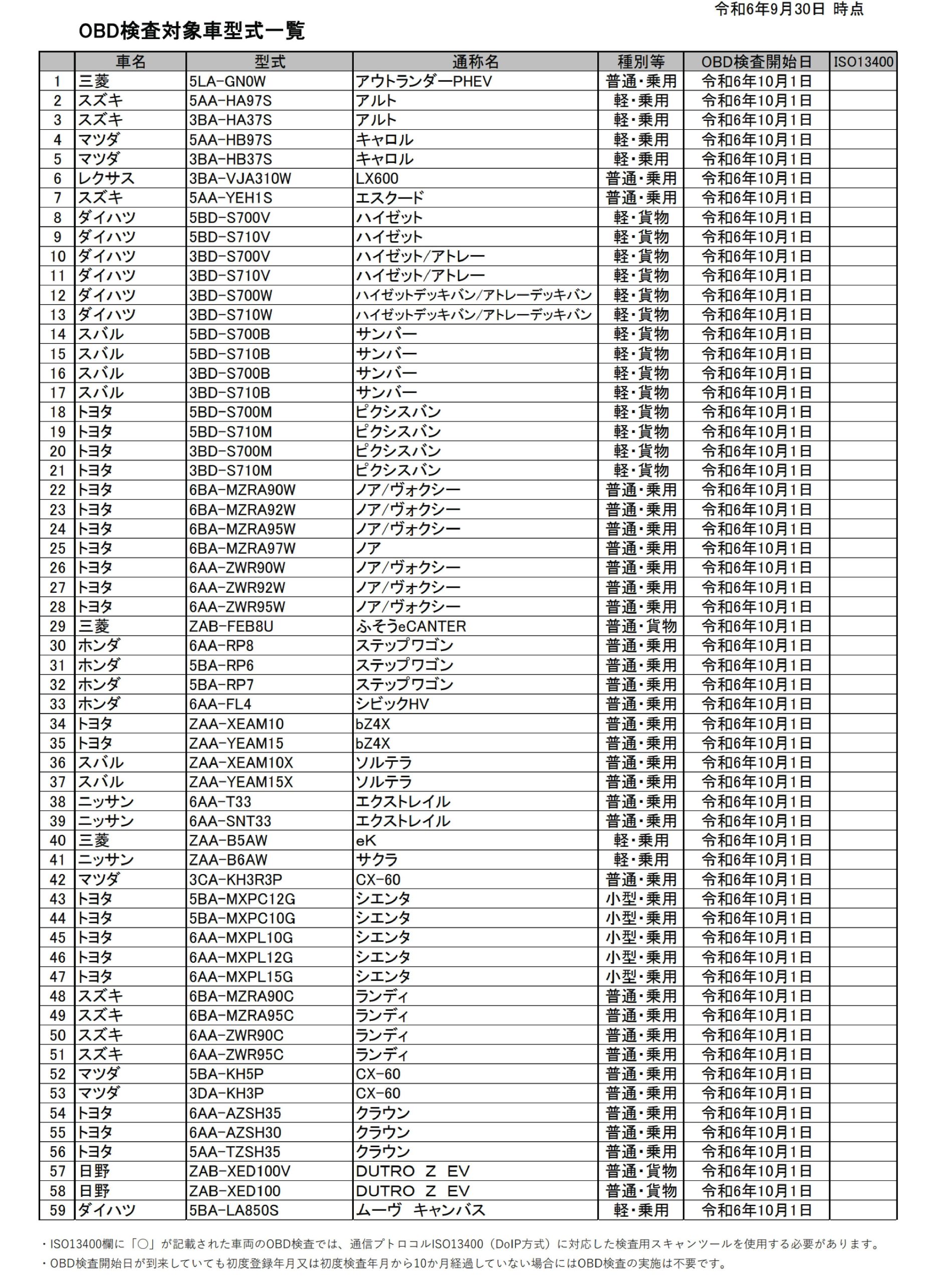 〈OBD検査〉対象車種の型式一覧(2024/9/30現在)