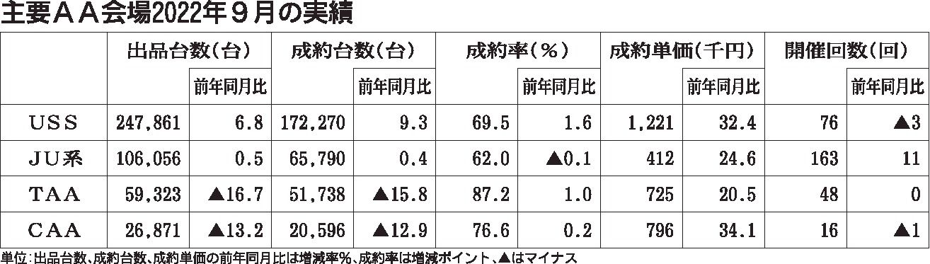 主要中古車オークション(AA)の取引価格が、上昇を続けている。2022年9月の主要AA会場の実績は、成約価格が前年同月比で2~3割上昇し、国内の小売り向けや海外への輸出など旺盛な中古車需要が価格に反映されている。最大手のユー・エス・エス(...