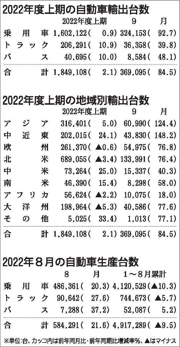 日本自動車工業会(自工会、豊田章男会長)が31日に発表した2022年度上期(4~9月)の輸出台数は、前年同期比2.1%増の184万9108台だった。半導体不足やコロナ禍の影響で前年の台数が少なかった国内生産が増加し、輸出台数も増えた。ただ、コロナ禍前の19年上期に比べると2割以上少ない水準にとどまった。円安の進行で国内からの輸出が有利な状況にあるものの、部品不足の影響により、輸出台数の大幅な増加にはつながっていない。