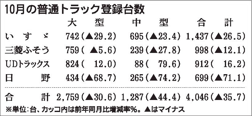 業界筋がまとめた2022年10月の普通トラック販売台数(積載量4㌧以上、大型・中型トラックの合計)は前年同月比35・7%減の4046台だった。生産制約の影響や、日野自動車のエンジン認証不正問題に伴う一部車種の出荷停止などもあり、12カ月連...