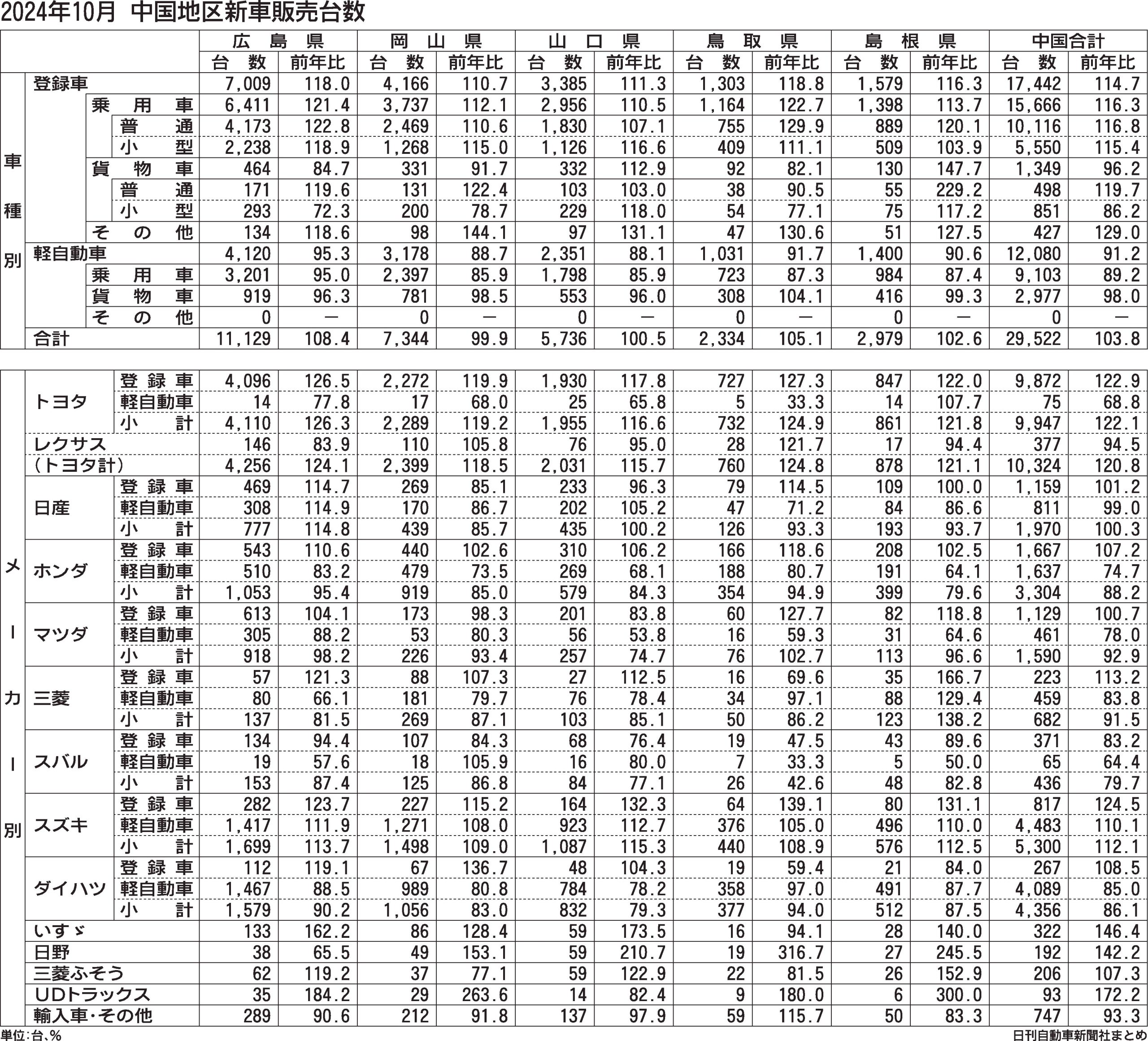 2024年10月の中国地区新車販売台数(登録車と軽自動車の合計)は、前年同月比3.8%増の2万9522台となり、2カ月連続で前の年を上回った。全国市場(同)の伸長率に対しても2.6ポイント高かった。好調を持続していたホンダが16カ月ぶりに...