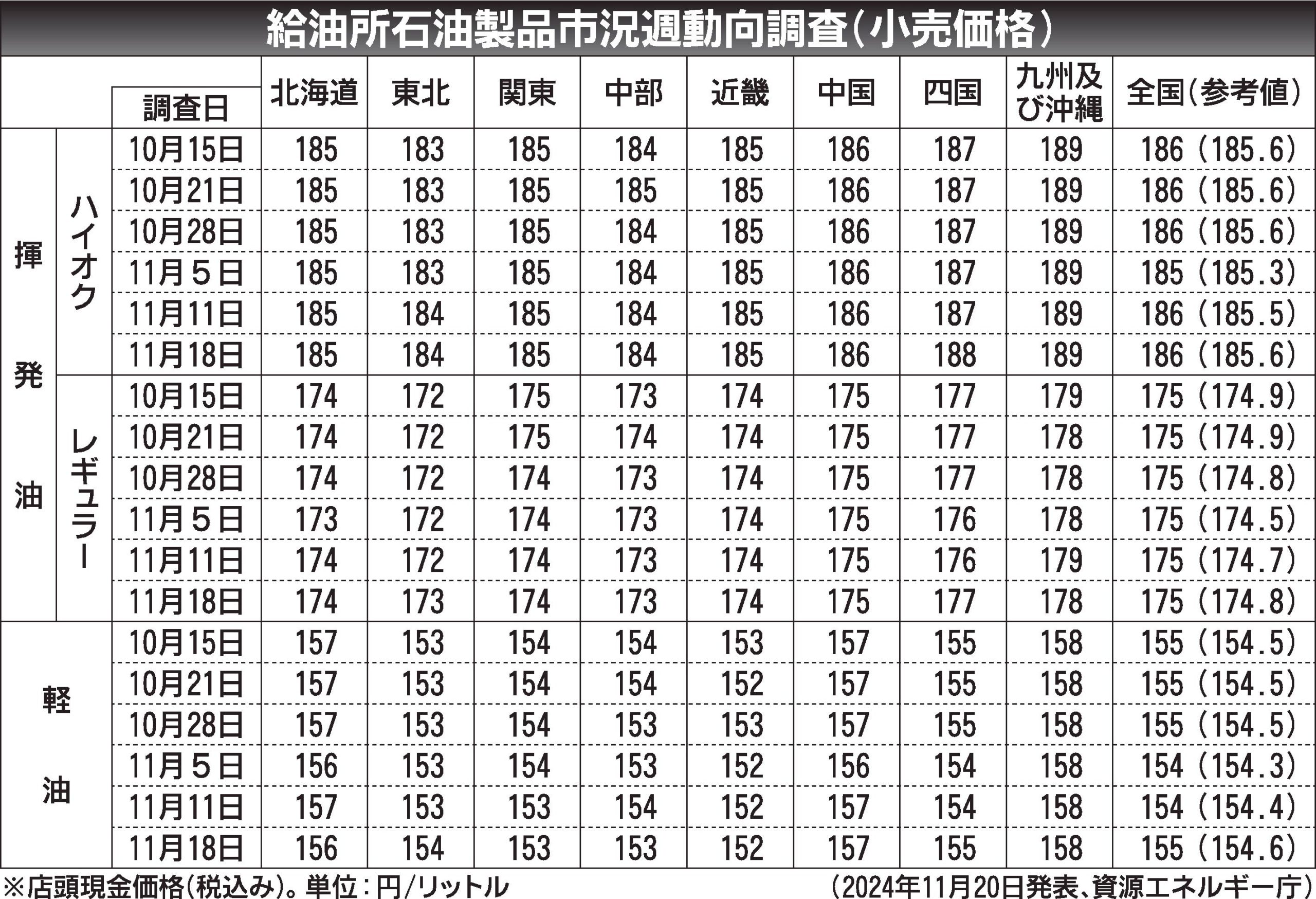〈給油所石油製品市況週動向調査(小売価格)〉2024/10/15~11/18