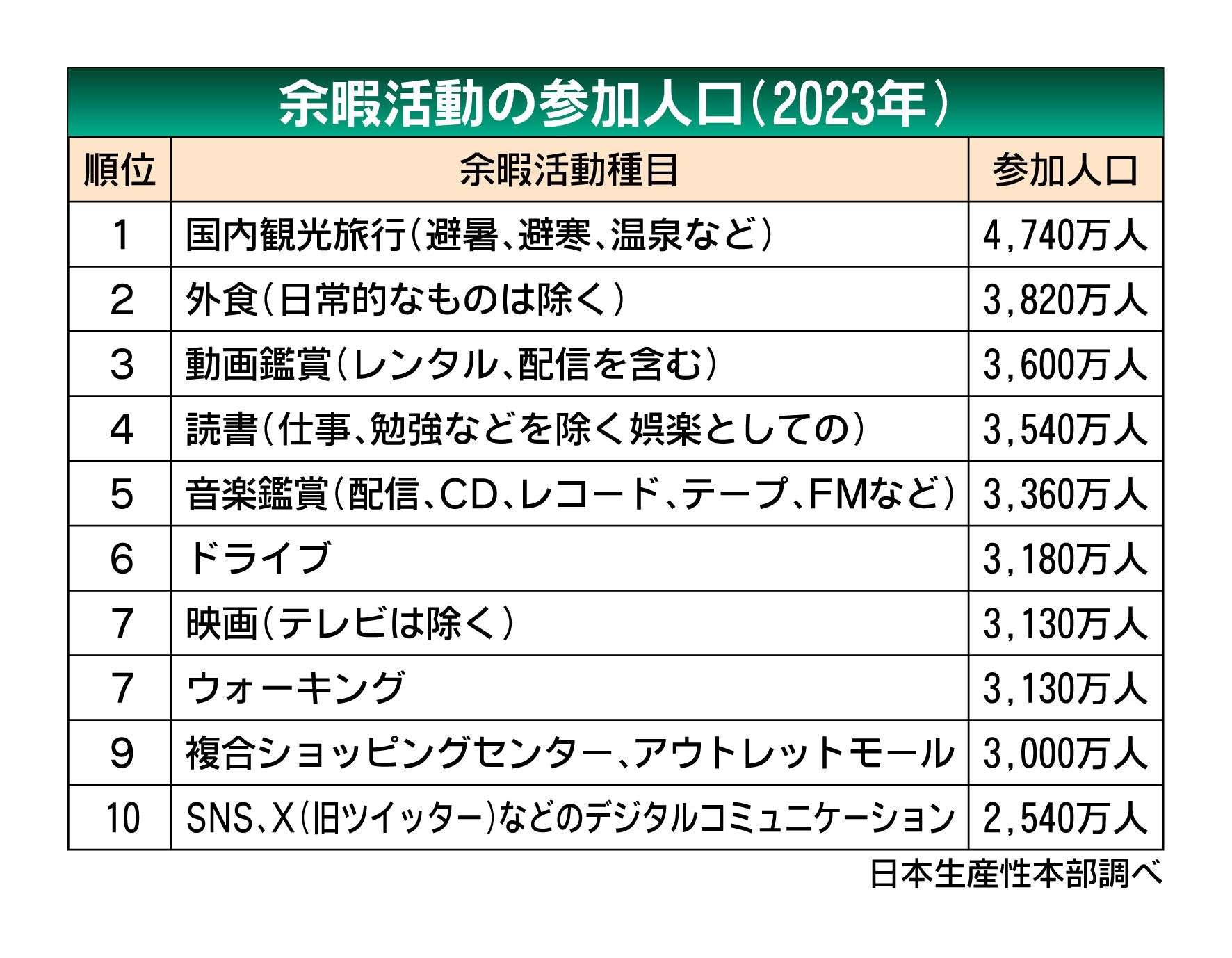日本生産性本部(前田和敬理事長、東京都千代田区)がまとめた「レジャー白書2024」によると、2023年に余暇を過ごす際に行った活動で「ドライブ」は前年比で120万人減の3180万人だった。順位も前年の5位から6位に下がった。トップは2年連...