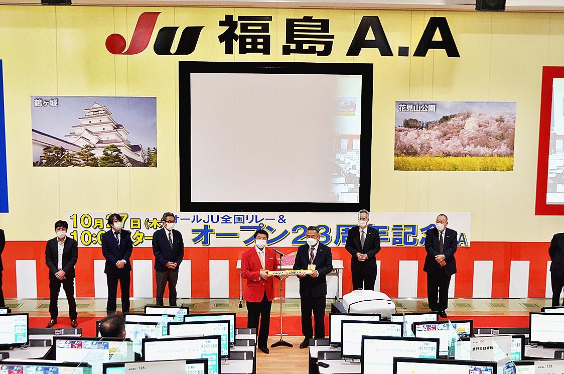 【福島】JU福島(橋本一男理事長)は、福島市の常設中古車オークション(AA)会場で「オールJU全国リレー&オープン23周年記念AA」を開催した=写真。全国リレーAAとして東北管内で4県目の開催となり、目標を大きく上回る出品で盛況な競りが開...
