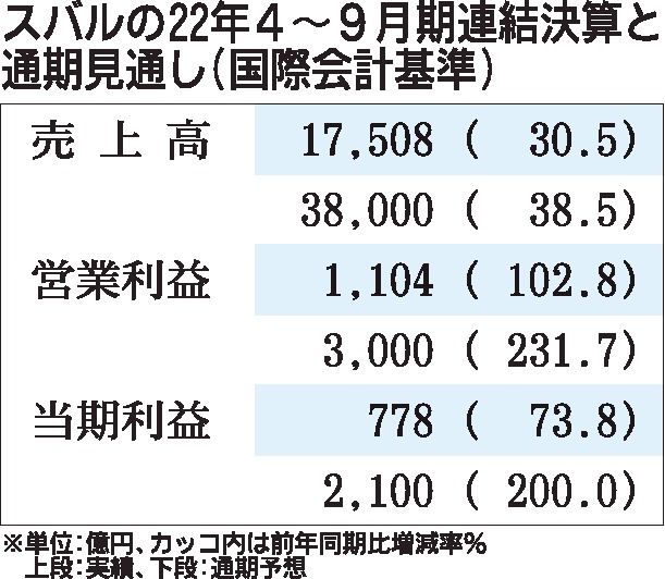 スバルが2日に発表した2022年4~9月期の営業利益は前年同期比で約2倍の1104億円だった。原材料価格の高騰が減益要因となったものの、円安による為替差益に加え、生産台数の増加や価格転嫁の効果で大幅な増益となった。通期の見通しは、生産計画を前回見通しより3万台少ない97万台に下方修正したものの、円安効果で売上高を3千億円多い3兆8千億円、営業利益を1千億円多い3千億円、当期純利益を700億円多い2100億円に上方修正した。売上高は過去最高になる見通し。
