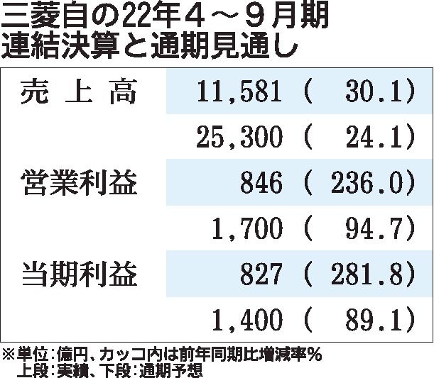 三菱自動車が2日に発表した2022年4~9月期決算は、売上高が前年同期比30.1%増の1兆1581億円、営業利益が同3.3倍の846億円で、増収増益となった。原材料高の影響があったものの、円安効果で相殺した。通期の見通しは売上高と営業利益、純利益ともに上方修正した。