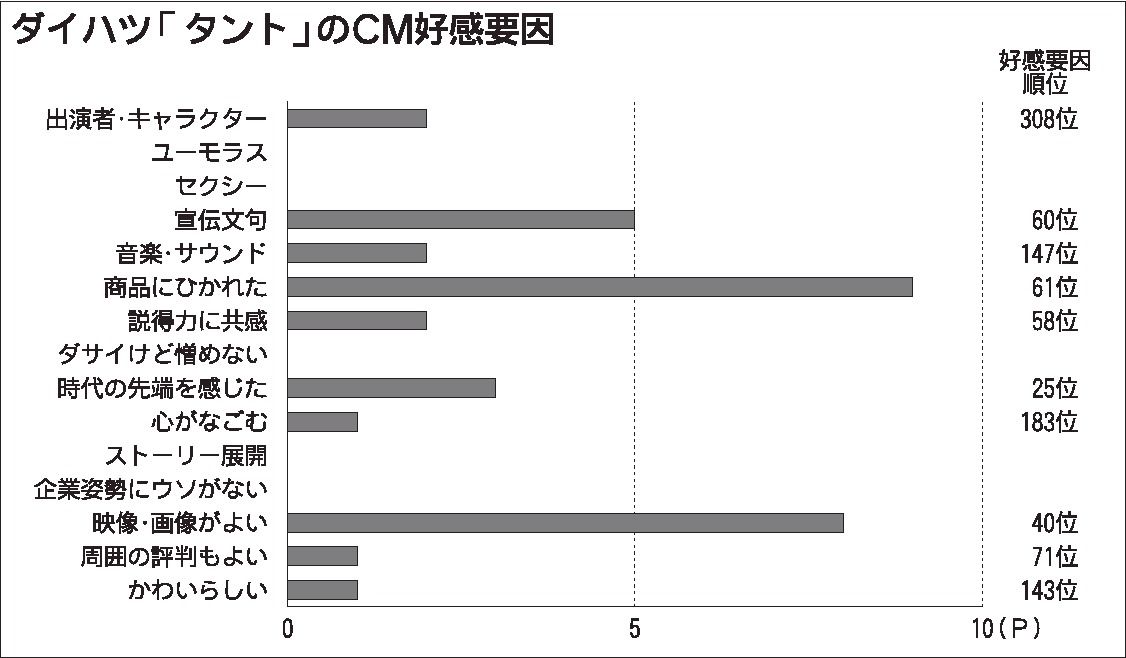 CM好感要因では「商品にひかれた」のポイントが最も高く、これに次いで「映像・画像」が好評価を得た。モニターからは「車の中が広々としていて快適そうだと思った」などのコメントがあった。