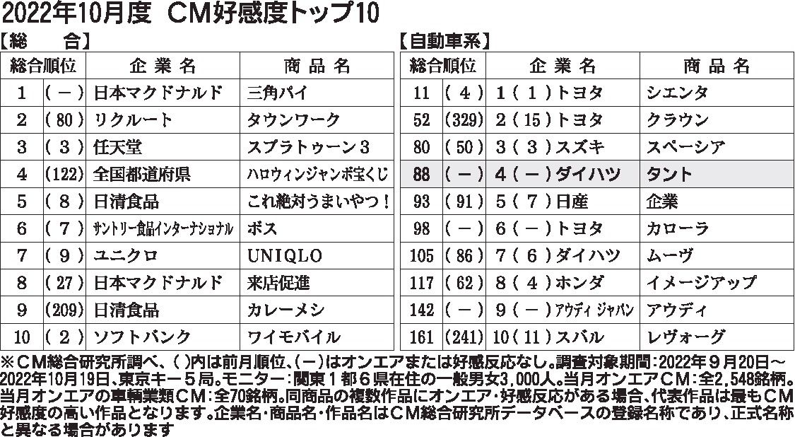 CM総合研究所(関根心太郎代表、東京都千代田区)は、2022年10月度のCM好感度ランキングを公表した。総合ランキングでは日本マクドナルド「三角パイ」がトップテン圏外から首位に浮上。リクルートの求人媒体「タウンワーク」がトップスリーに返り咲き、任天堂のゲームソフトが3位をキープした。前月4位だったトヨタ自動車の新型「シエンタ」は11位にとどまり、自動車業類は2カ月ぶりにトップテンを逃した。