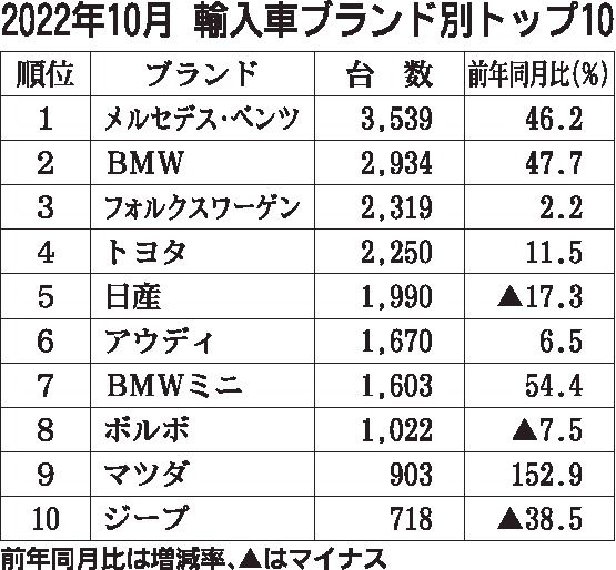 登録車全体に占める外国メーカー車のシェアは8.4%で、10月としては統計開始以来5番目に多い水準。外国メーカー車のブランド別ではメルセデス・ベンツが同46.2%増の3539台で首位となり、2位はBMWで同47.7%増の2934台、3位はフォルクスワーゲンで同2.2%増の2319台と、上位ブランドが軒並み前年同月を上回り全体の実績を押し上げた。ルノー、ランドローバー、フェラーリ、ランボルギーニの4ブランドが10月としての最多台数を更新した。