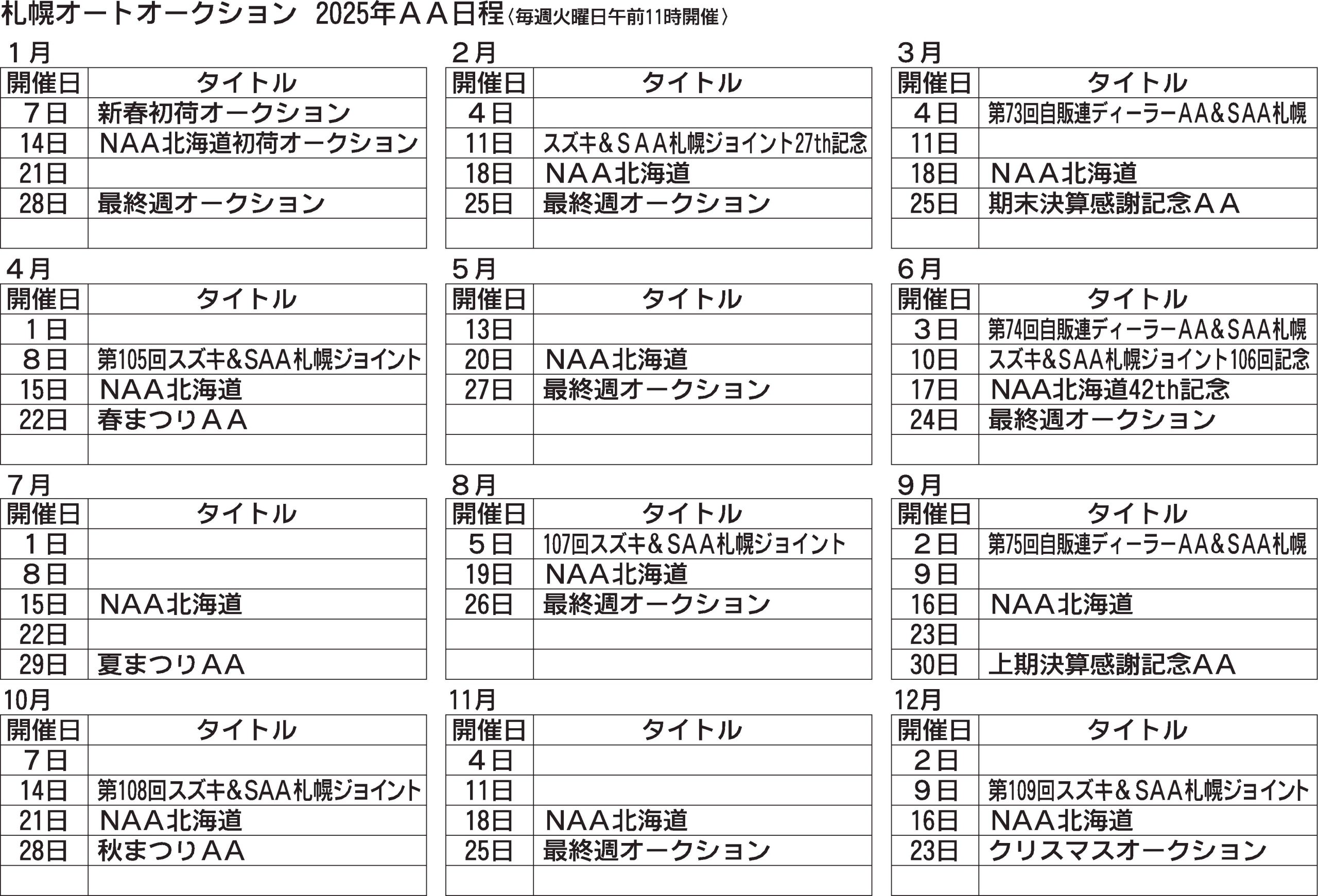 札幌オートオークション(SAA、土谷州治社長)は、2025年中古車オークション(AA)日程をまとめた。年間で48開催を予定する。 年初は1月7日からスタートし、SAA単独での記念AAをはじめ、スズキや自販連との合同AA、毎月第3週をめどに...